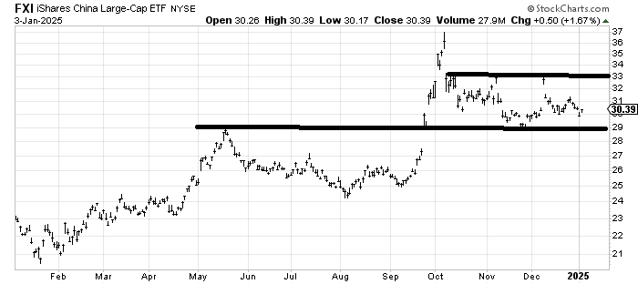 I have not spent a great deal of time discussing what I believe is the relationship between the majority of stocks here and the Chinese market but it’s there. That peak in October shows up on so many of our charts. FXI has been in a trading range for three months now so when it’s at the bottom of the range I look for a rally to the top and vice versa. Until that changes the set up is there. So a rally toward 33-ish.