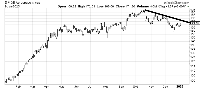 GE Aerospace GE is the poster child for what many stocks did last year. It peaked in the spring (we discussed this a month or so ago) then had a nice rally into October when that was it (the majority of stocks have been going down since October). Then it bottomed on the FOMC day and made a higher low last week. It has resistance all the way up but isn’t it possible it is sold out and can cross that line?
