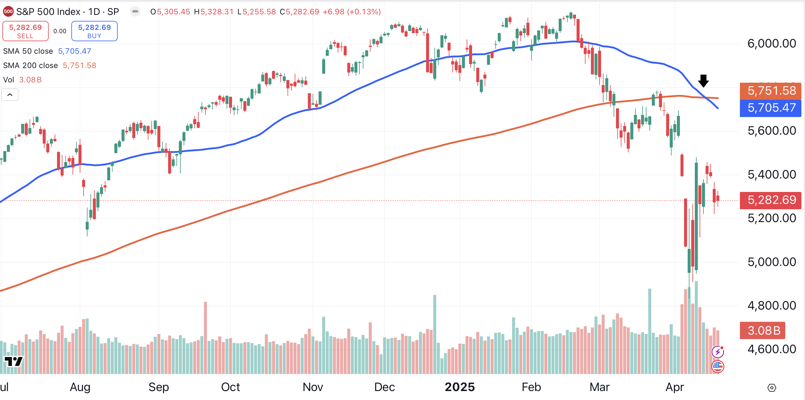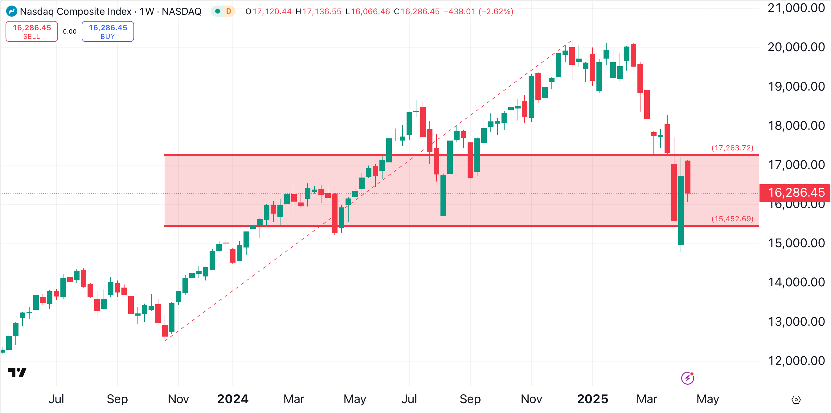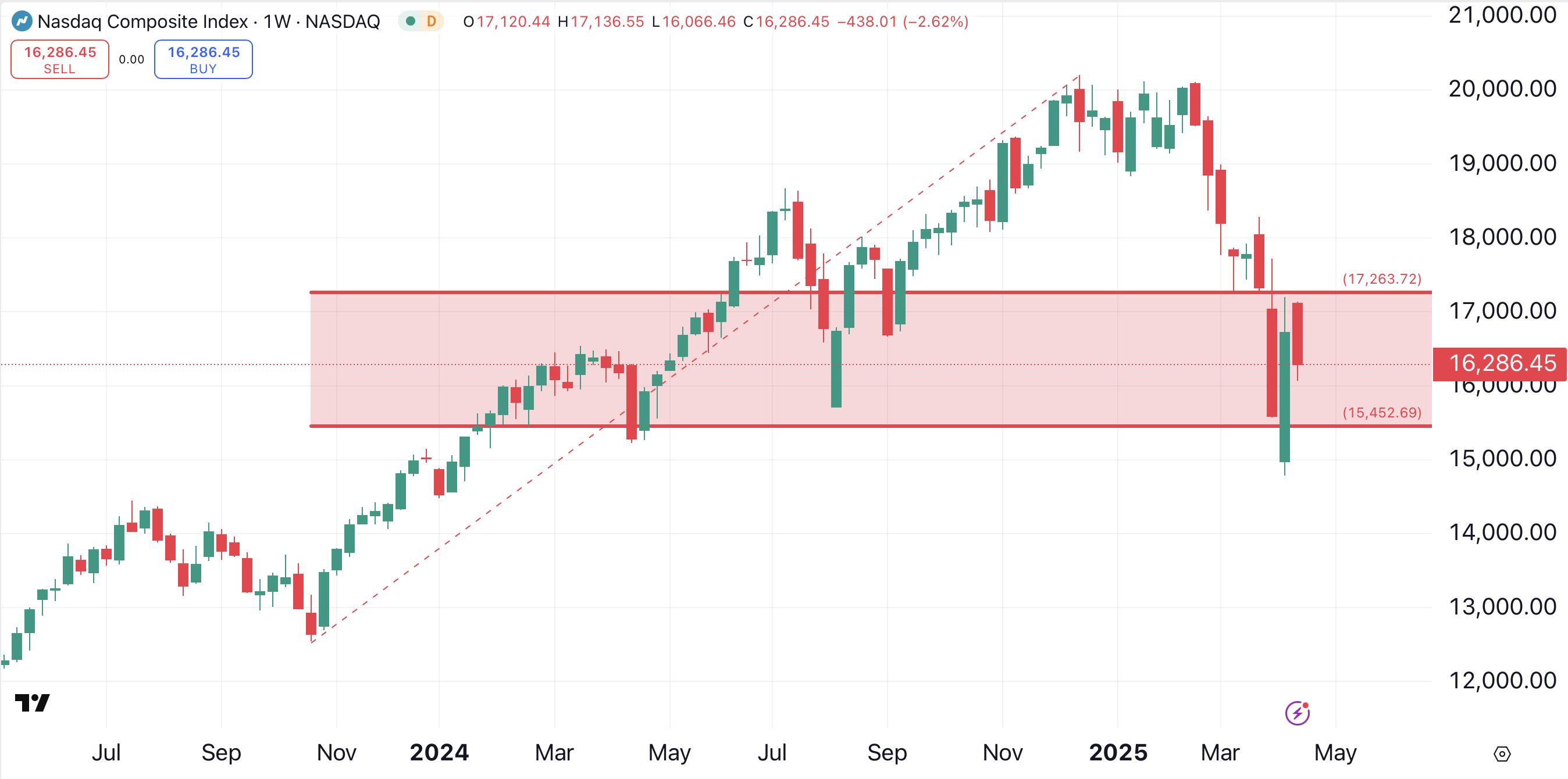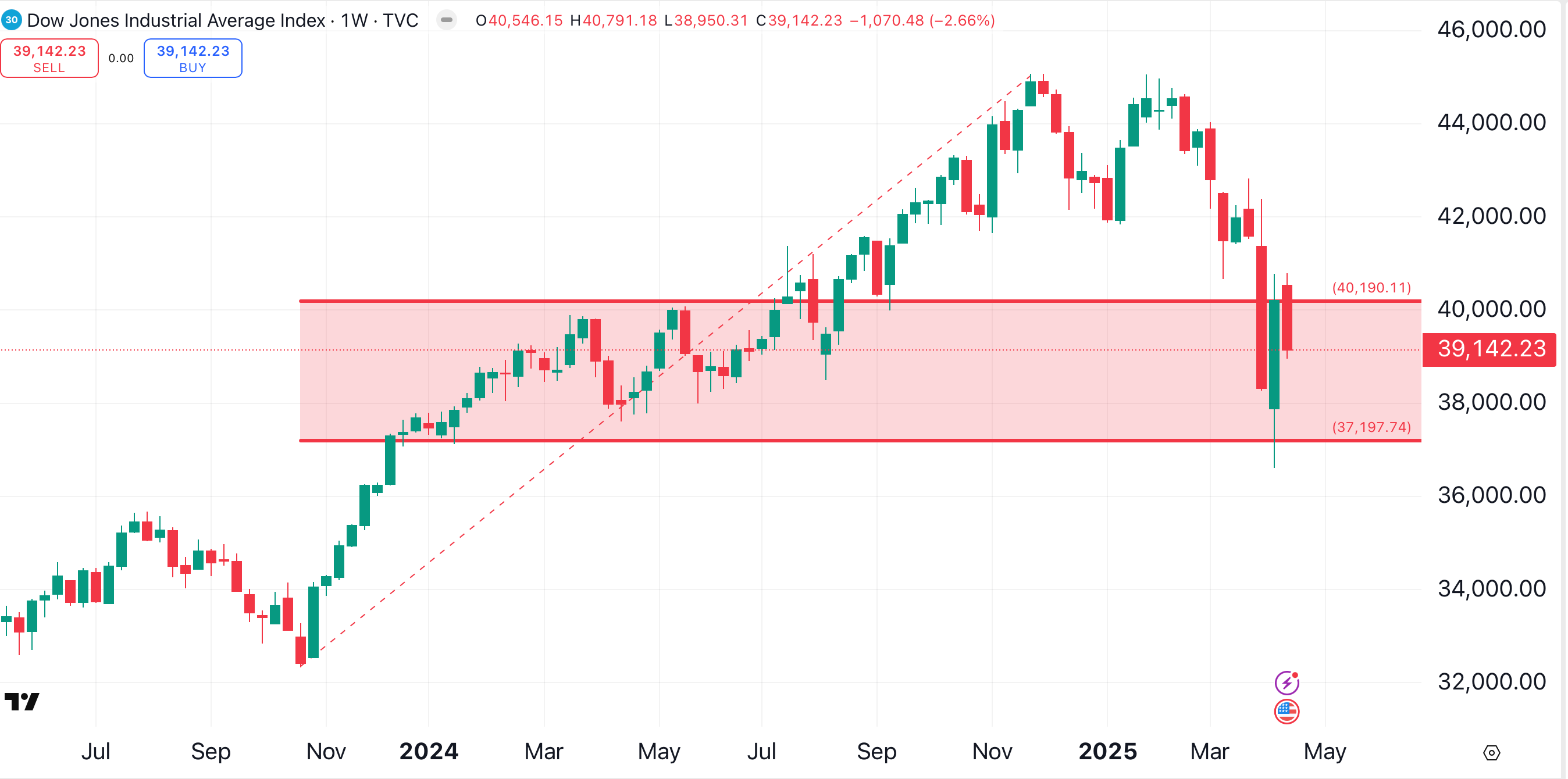 The Dow Jones Industrial Average presents a similar setup. This chart shows a potential downside of about 2500 points from Thursday’s close to the April 7 low. Meanwhile, there are over 5700 points of upside from Thursday’s close to the index’s all-time high.