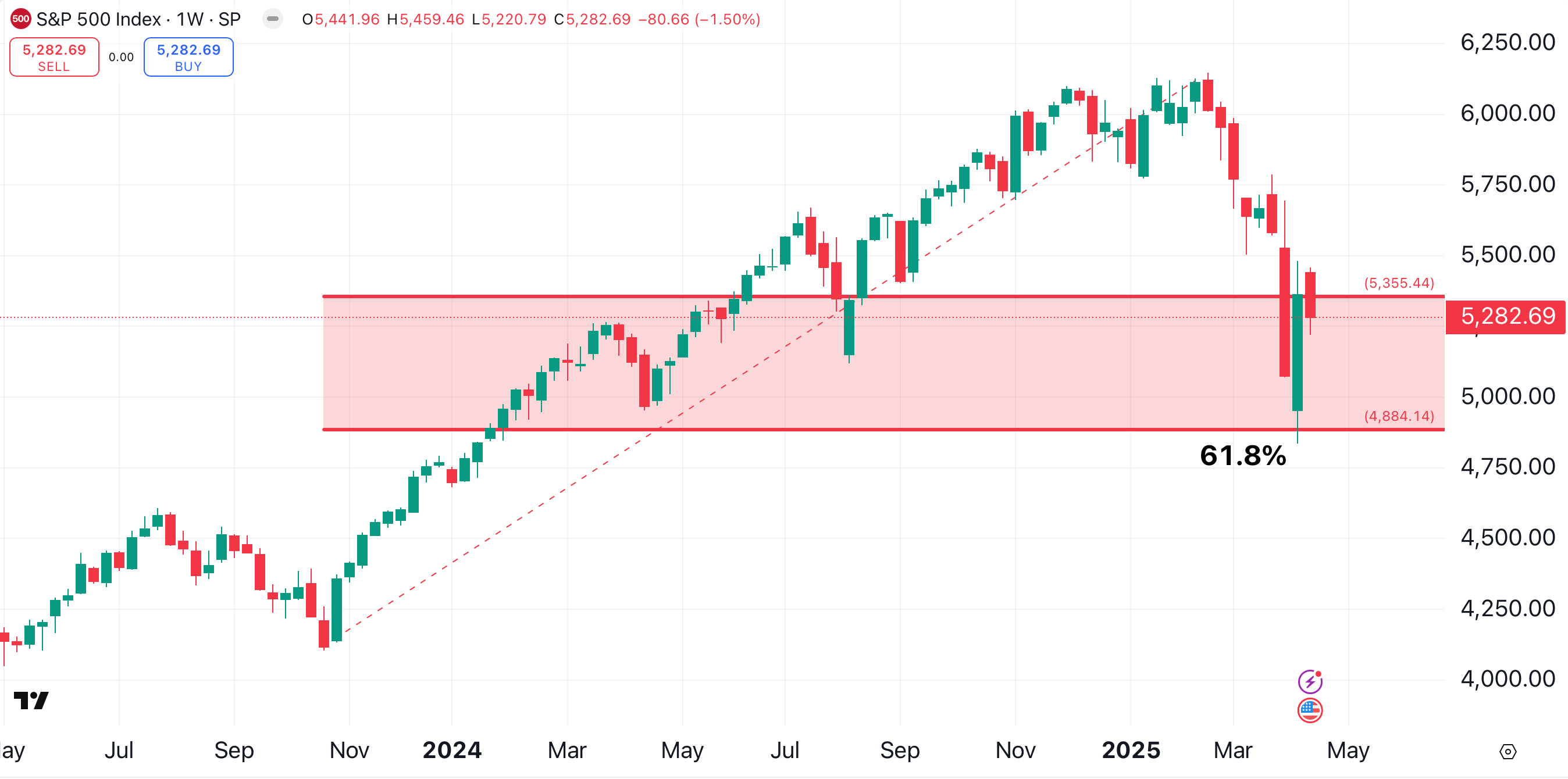 Now let’s zoom out to the weekly chart. In this timeframe, the S&P 500’s pullback appears less ominous. This simple chart depicts the S&P 500 bouncing sharply from a 61.8% Fibonacci retracement of the October 2023-February 2025 rally.