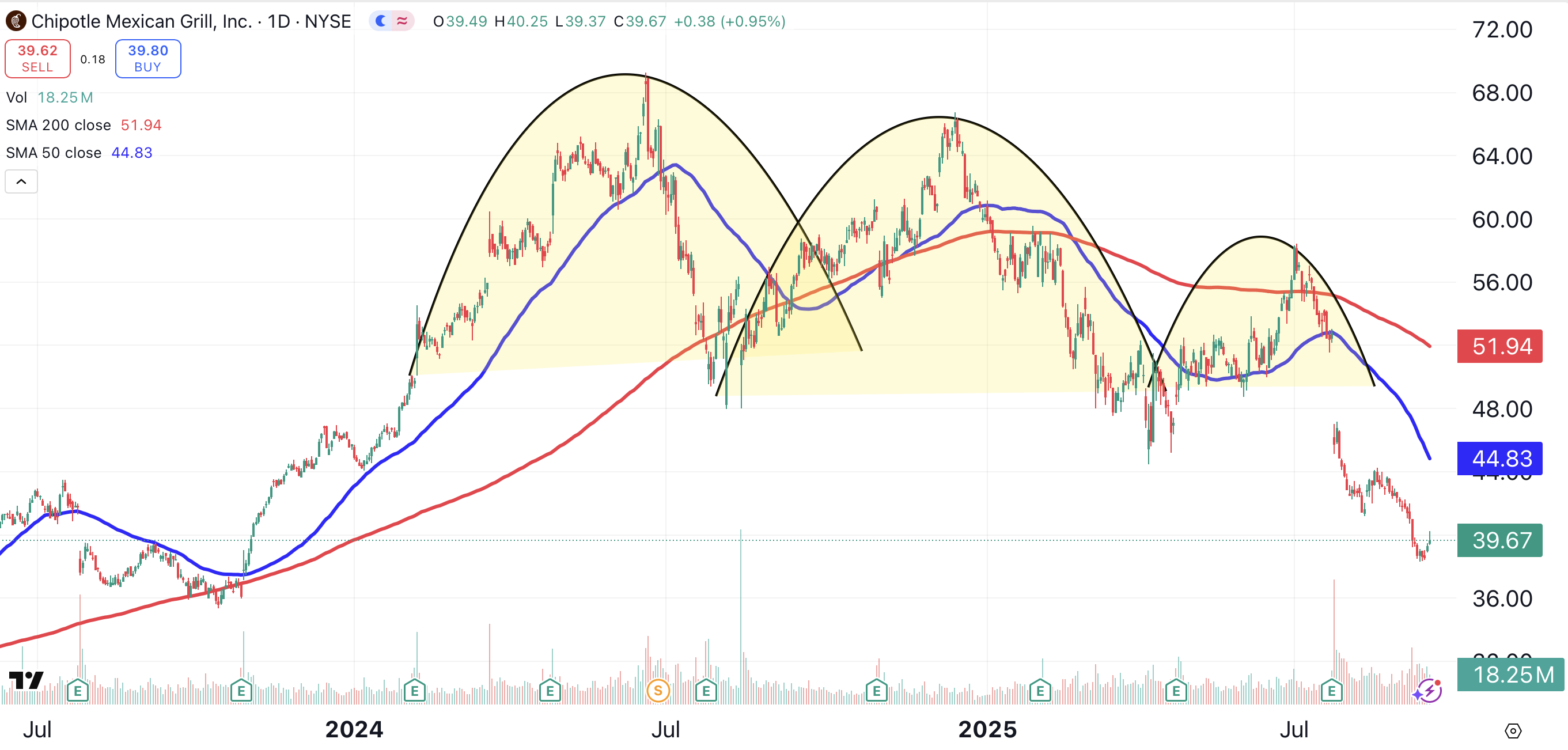Chipotle’s chart looks terrible. The stock has broken down from a large triple-top pattern (shaded yellow) that formed over an 18-month period. Chipotle is trading well below its 50-day (blue) and 200-day (red) moving averages, which are both declining. The stock recently reached its lowest price since late 2023.