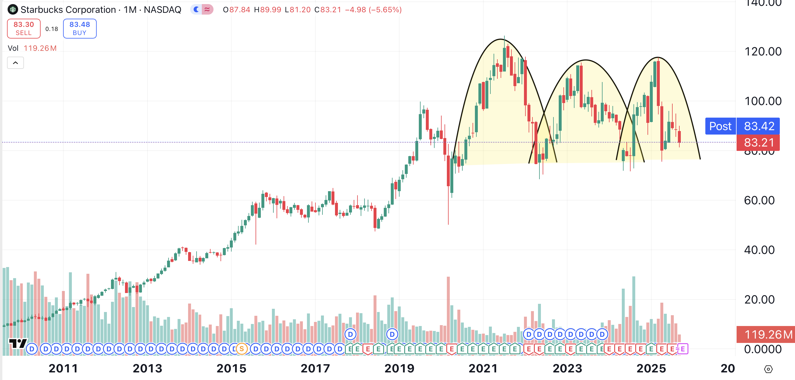 Starbucks shares have also formed a triple top pattern (shaded yellow). This pattern formed over a five-year period, and is so large I used a monthly chart to help readers visualize the formation.