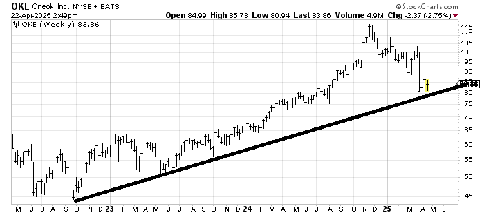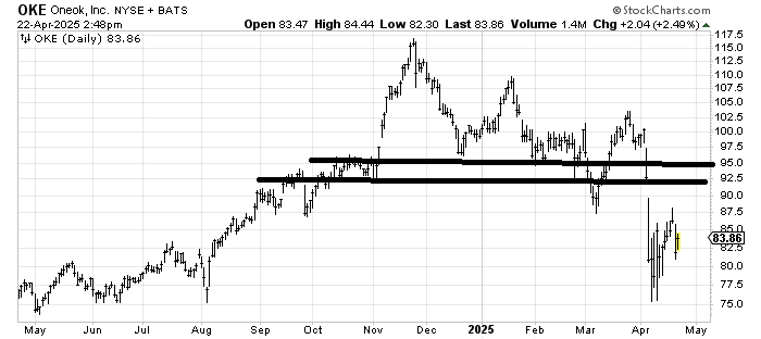 Oneok OKE has one good thing I can say about it: when it got to 75, it tagged the measured downside target. In the short term, 92-93 would be a good place to sell it. On a longer-term chart, it hasn’t done anything wrong. I just don’t like that big gap that needs to be filled.