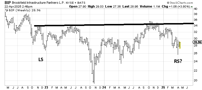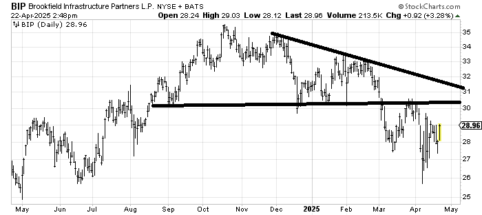 We can see the resistance overhead on the chart of Brookfield Infrastructure Partners BIP, so I’d say I’m a little bit positive on it in the short term because it ought to make its way there to resistance.