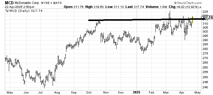 I recommended McDonald’s MCD back in January, and I admit it has held up rather well. I don’t love buying stocks that are up and have had very little selling, but the chart hasn’t done anything wrong yet. In the short term, that spike high at 325 is going to be difficult.