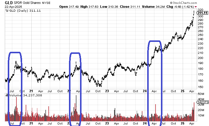 Let’s start with the chart of GLD. We have not managed to get the DSI over 90, but the volume in GLD today is the highest since early 2022. Long-time readers know I like high volume declines in the QQQ (recall we had over 100 million shares trade two weeks ago). When it comes to GLD, high-volume rallies tend to be a problem. At the very least, a correction is needed.