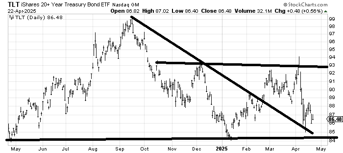 I was asked to address TLT again. It trades poorly, but I look at this chart, and it does not have the look of a chart about to break down. It continues to have the look of a chart that is going sideways in a wide range. Should it crack under 84 in a major way, I would have to reassess my view, but that’s not my current base case.