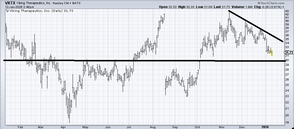 I don’t like the chart of Viking Therapeutics (VKTX) , but I do think there is an awful lot of support at 30. But it also has a lot of resistance overhead. It’s difficult to want to buy it with all of that resistance, but if it can bounce from 30 it ought to get to the downtrend line on a bounce.