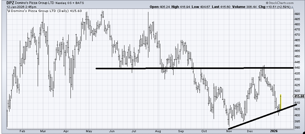 Domino’s Pizza (DPZ) is trying to bottom but it is early and there is much resistance overhead. It’s oversold enough to rally for a few more days.
