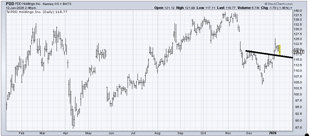 PDD Holdings (PDD) seems to be testing its breakout. I’d like to see it hold this 115 after and fill that gap overhead around 128.