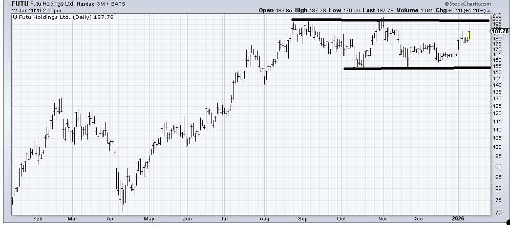 Futu Holdings (FUTU) is trying to rally. Can it get out of the resistance at 200? I would like to think so, but let’s see how it acts when it gets up there. The chart has gone nowhere for nearly five months, so it’s done the work.