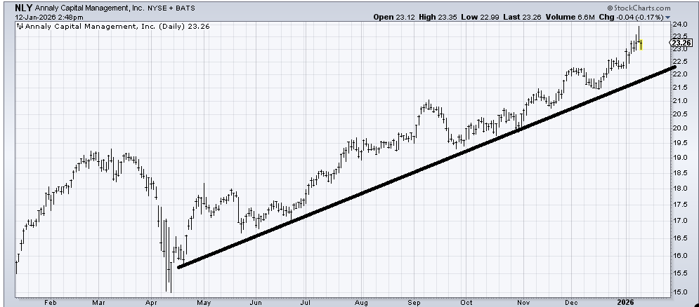 Annaly Capital (NLY) is in an uptrend, so if it pulls back to the line I’d be a buyer. But I can’t chase it.