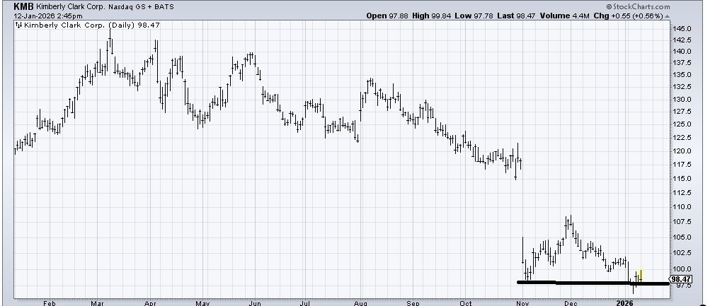 Kimberly Clark (KMB) is not one of the staples stocks I have considered buying lately, even for a trade. But now I am considering that it could play catch up in the coming weeks. I’ll be wrong if it trades much under 96.