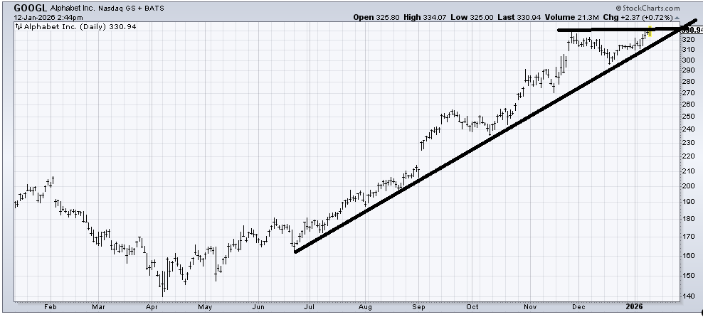 Alphabet (GOOGL) hasn’t done anything wrong but up here it is not my kind of chart just because it has had such a run. I call it a hold with a stop under that uptrend line (310-ish).