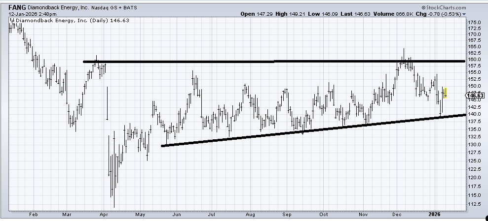 Diamondback Energy (FANG) has been going sideways for almost a year, so I would lean toward thinking we eventually see a breakout to the upside, obviously with a stop under 140.