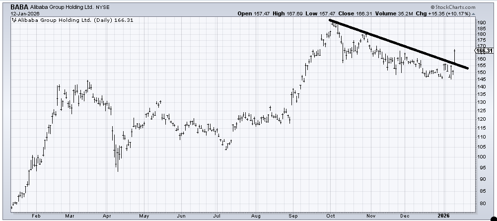 We finally got that rally in Alibaba (BABA) over the line. So where does it go now? There is resistance all the way up so I don’t have a proper target yet, but for now pullbacks look OK to be bought. Keep in mind this stock trades quite thinly so we can easily see it give back a chunk of Monday's gain.