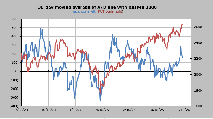 The 30-day moving average of the advance/decline line has come down quite a bit. It probably has a little room to head back up before getting back to overbought again next week.