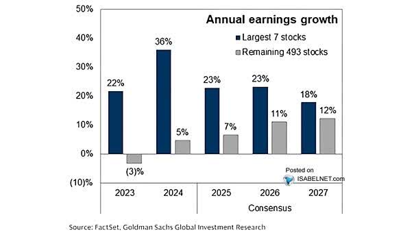 These names, like Microsoft (MSFT) and Nvidia (NVDA) , have also been responsible for the majority of profit growth within the markets since ChatGPT debuted late in 2022. Earnings growth from the "S&P 493" have averaged approximately 3% annually from 2023 to 2025. However, based on bottom-up analysis compiled from FactSet and Bloomberg, that profit growth is projected to rise significantly to just over 10% for both 2026 and 2027. I would take those estimations with a substantial grain of salt.