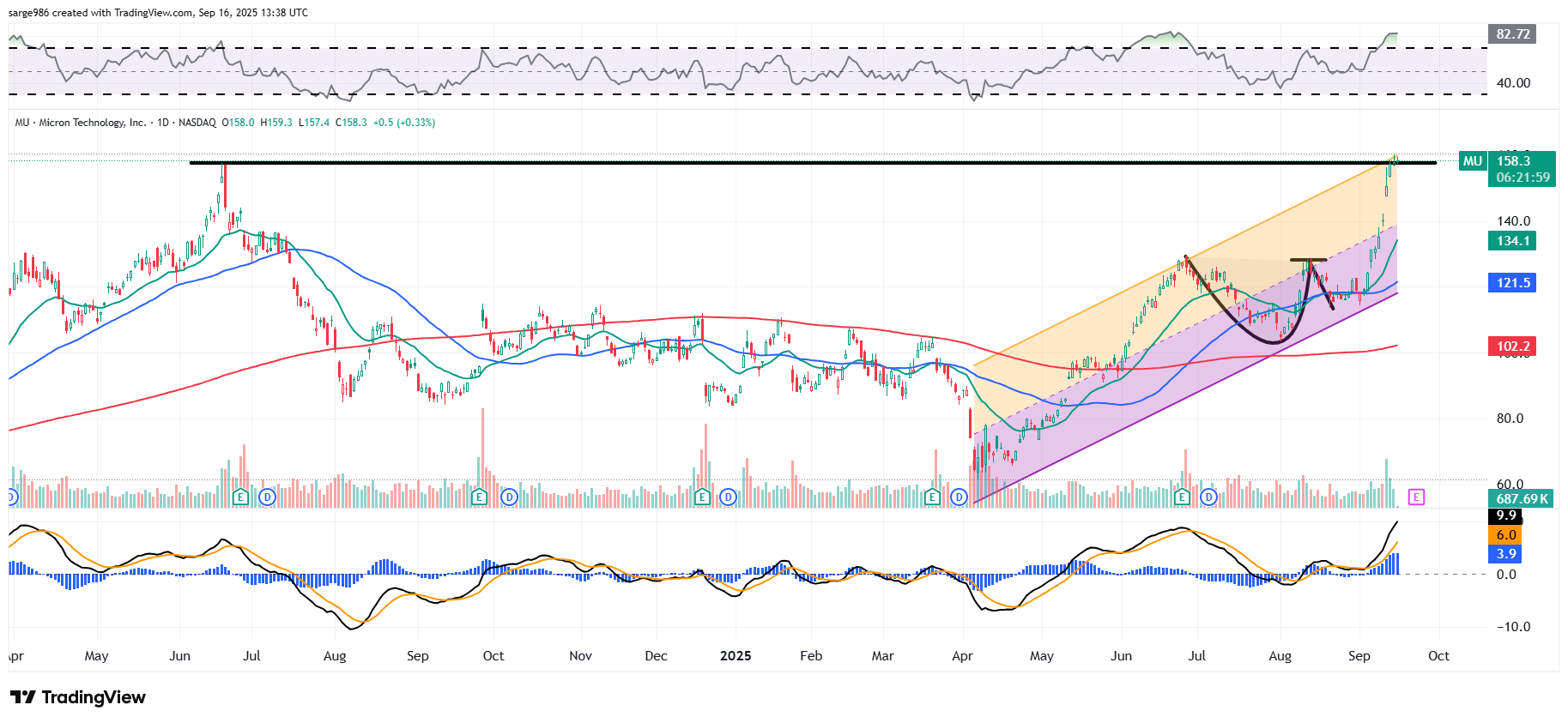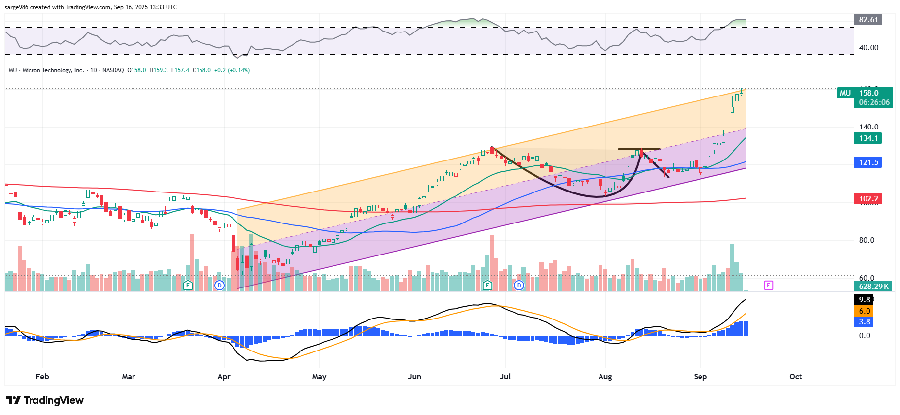 Readers will see that MU broke out of a late June through mid-August Cup with Handle pattern with a $128 pivot in early September. That would put the target price using my model at $153, which has been exceeded. Is the stock extended? Well, yes. Relative Strength is in a technically overbought state. The daily Moving Average Convergence Divergence is also looking like it's just too bullish in my opinion. Should investors take profits? I will be, but I'm not going flat the name. I don't like holding onto stocks that run wild going into earnings. You all know that.