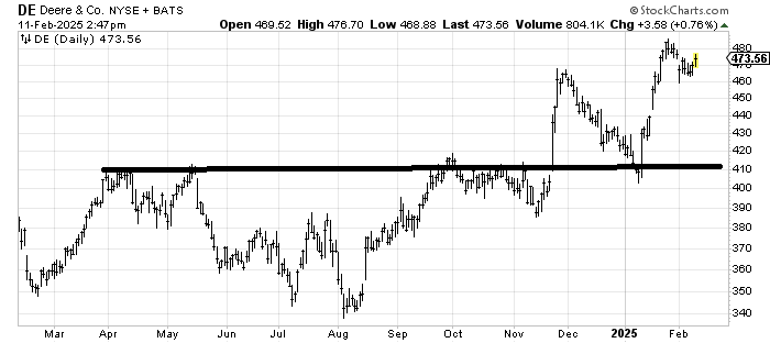 Deere DE hasn’t done anything wrong but the measured target off that base was 480 which is where it got to. If it can go sideways and digest the recent move then it sets up another pattern we can look at but otherwise I see no reason to chase.