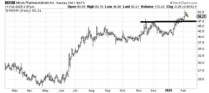 Mirun Pharmaceuticals MIRM hasn’t done anything wrong. There is a next measured target around 54. There is light support at 47 if you are looking to buy it.