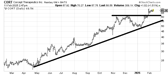 Corcept Therapeutics CORT is a stock in an uptrend with a next measured target not far away, around 70. The uptrend line is your support/stop area.