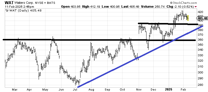 Waters WAT has a measured target of 440-ish. Trading back under the blue line would be a problem for me.