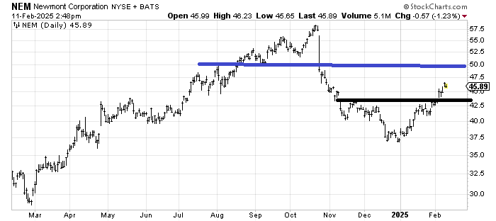 Newmont NEM has a short-term measured target around 47 with resistance at 50, so I’ve been eyeing that area of 47 to 50. But I am also monitoring the DSI for gold which has not yet tagged 90, shockingly.