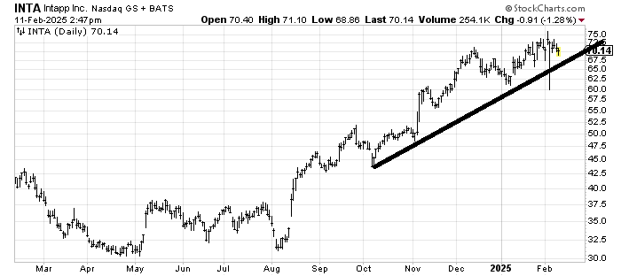 Intapp INTA has had some wild moves of late. Minor support is the uptrend line, but I would view 60 as important. There is no pattern that makes this a top yet. To get a top would mean a move down to 60-ish and a failing rally.