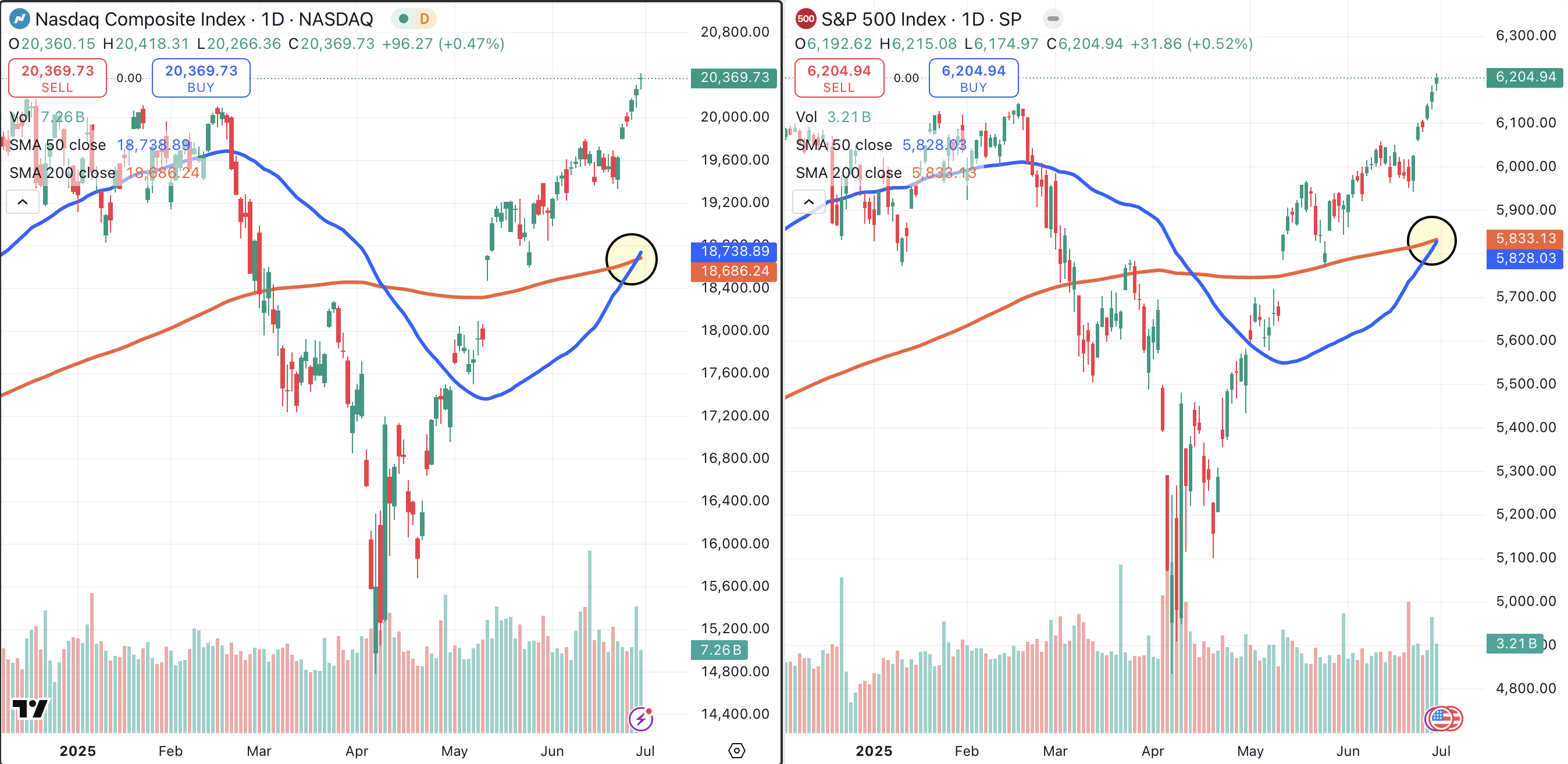 The Nasdaq (left chart) has closed higher for six consecutive trading days. The tech-laden index has also just formed a golden cross (shaded yellow). This bullish indicator flashes when a rising 50-day moving average (blue) crosses above a rising 200-day moving average (red).