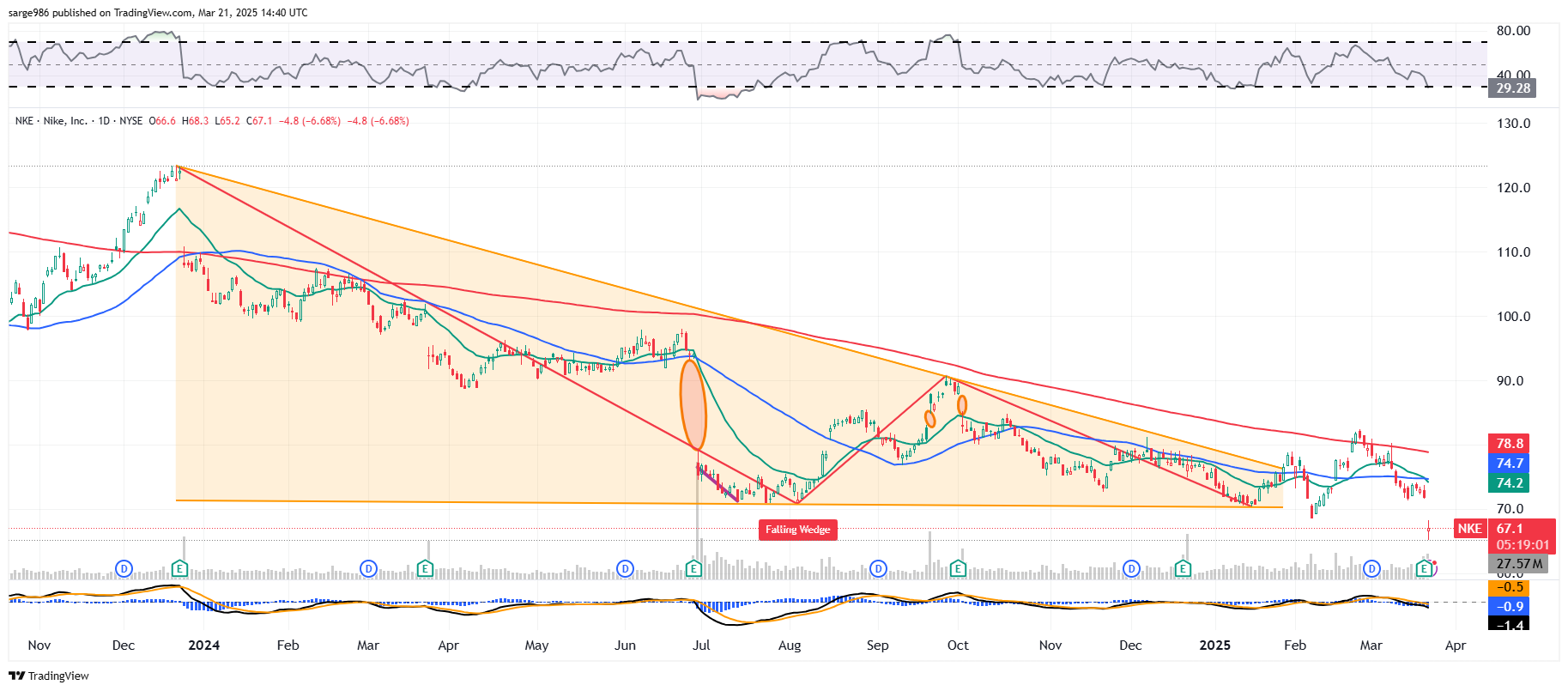 Readers will see a giant falling-wedge pattern of bullish reversal that goes back to late 2023 and culminated in January. The stock tried to break out at that time, possibly in response to the return of Nike loyalist Elliott Hill to the company as CEO. We're six months into his tenure. I would think that the firm would be making better strides toward success by now. I also would have liked to see a little more leadership from Hill during the call and maybe a little less reliance upon the CFO to do the talking.