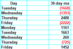 The rule of thumb is that when we stop dropping big red numbers and start dropping big black (or green) numbers, we are overbought. You can see that Friday is the last of the big red numbers to be dropped. Remember, the exact day is not what matters; it’s the general time frame, and we are getting into that general time frame.