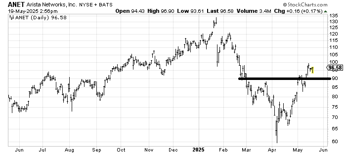 Arista Networks ANET has two things going for it. The first is that it has been correcting for a week now. The second is that it is over 90, and 90% of the stocks that make it to 90 will make it to 100, which it already did last Monday. What it doesn’t have going for it is that there is resistance all the way up. So I’ll say the stock is okay as long as it stays over 90. What it does in the next few days is a coin toss to me.