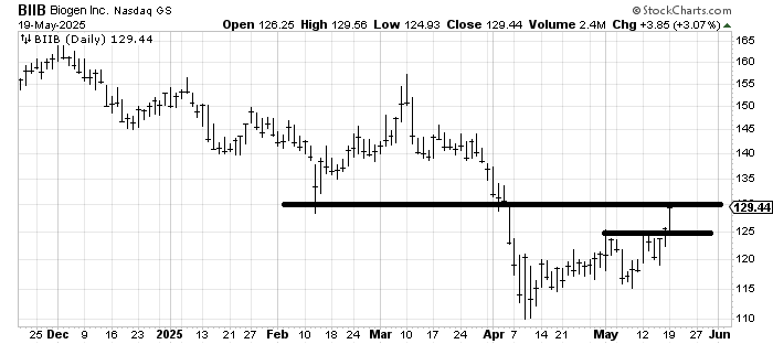 We finally got the move to resistance in Biogen BIIB–you see? Drugs are doing well in the last few days!—I would be inclined to take a little off here, and I would use a stop under 125 for the remainder.