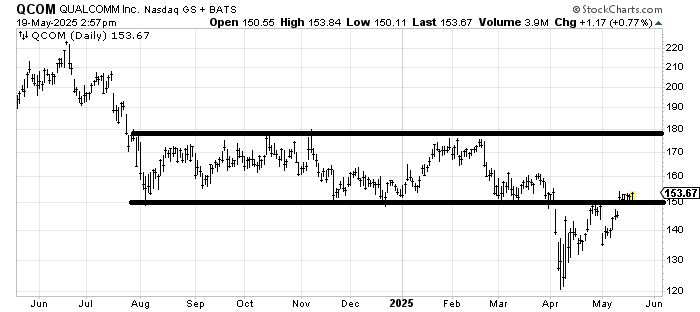 I should probably start the review of Qualcomm QCOM by noting that late last year, I liked the stock because it hadn’t broken down and looked to be basing. It rallied and then just collapsed. That means this entire area between 150 and 180 is resistance. On a short-term basis, I don’t want to see it head back under 150. Maybe it fills that gap below (145), but a strong stock should not cross back under support once it has inched over it.
