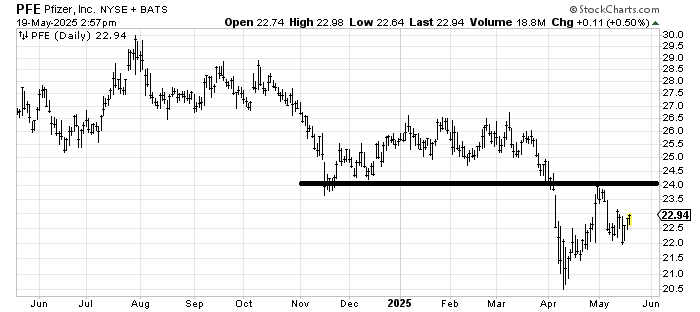 All it took was for me to say something nice about the drugs, and the Pfizer PFE chart comes up. I think it can rally to 24, maybe even higher. But the stock has not made a higher high in almost a year, so I’m going to start with 24 and see if it can get over that.