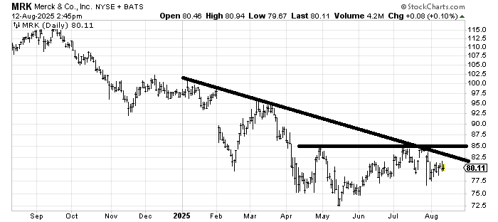 I have been of the mind that Merck MRK was trying to build a small base. It’s still too small to fuss over. But as long as it doesn’t take out that May low it should be considered base building. If it can get over 85 it would be one more step toward base building.