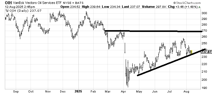 We finally got the rally to fill that April gap in OIH. I was hopeful it would pullback and rally again but so far it hasn’t. If it breaks 230 I will give up on that idea. That is my line in the sand, something under 230.