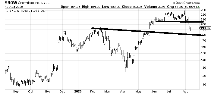 Finally, I promised to follow up on Snowflake SNOW. It hasn’t been as awful as so many other software names but it’s not been great. The little top it broke down from measures into the 185-190 area and it got to 188 today. It may still fill that gap but the stock is getting oversold and is near support. Just for a trade.