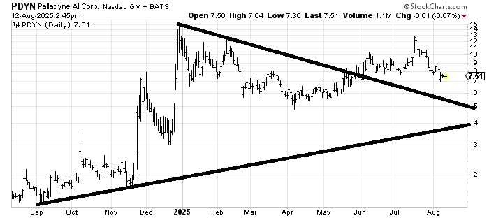 Palladyne AI (PDYN) has good support back in that 5-ish area. Notice how before the runup in early June it had scooped or rounded under. Then before the July run up it also rounded under. If it is going to make another run, my guess is it will need to form that type of pattern again.