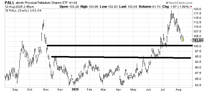 PALL, an etf to be long Palladium, is enjoying a much needed correction. I would look for some stabilizing again in that 95-100 area, hopefully it will then round under and get interesting again.