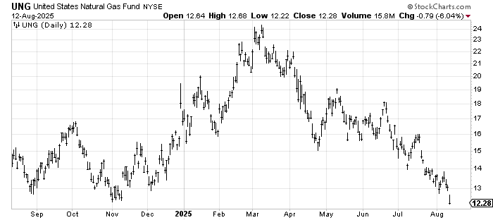 I am going to start with UNG, an ETF to be long natural gas, because the DSI is 20. The chart is hideous and actually measures to 8-ish. But if that DSI gets under 15, this will be worth it for a trade to the upside.