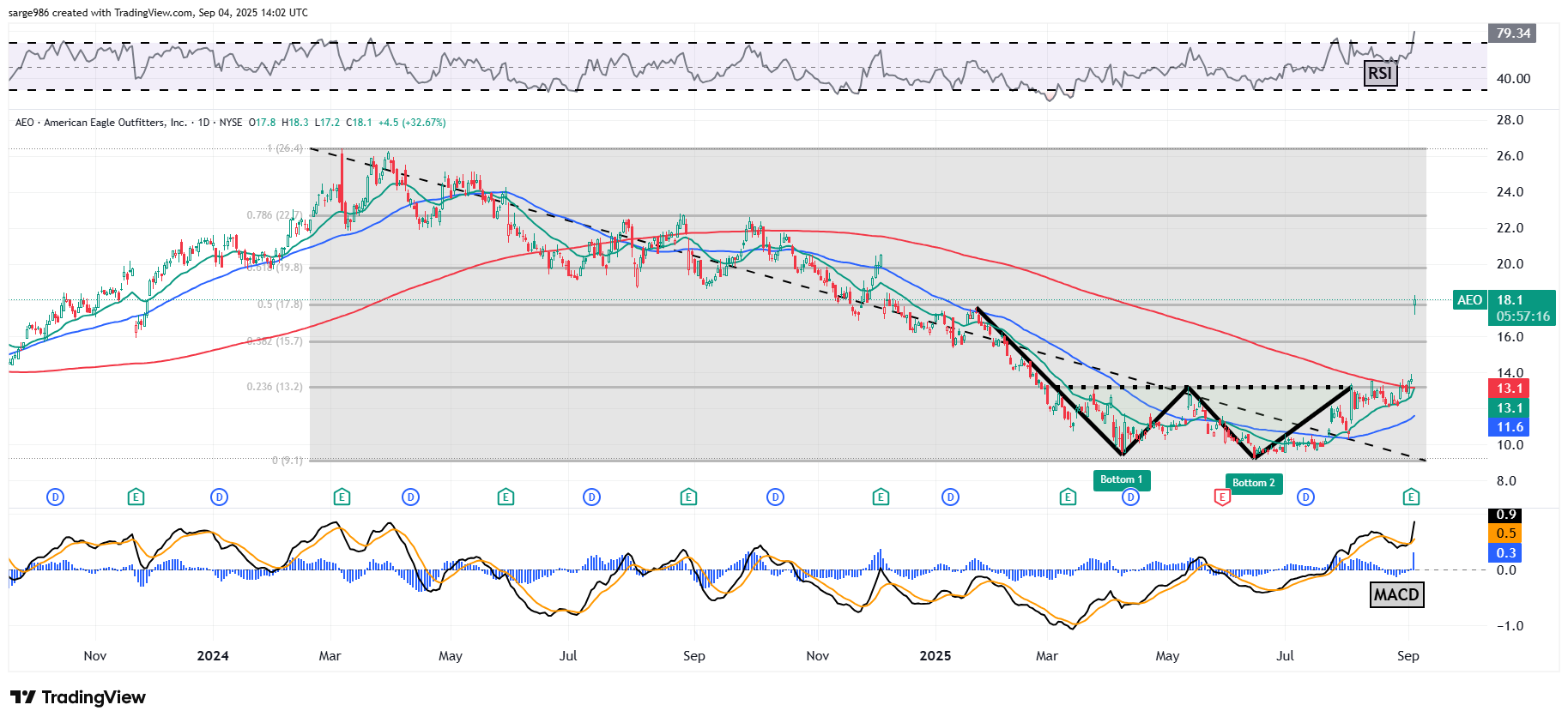 ​Readers will see that AEO formed a double-bottom pattern of bullish reversal this past spring with a pivot that ran alongside a 23.6% Fibonacci retracement of the stock's late February 2024 through June 2025 sell-off. The break above that "double-powered" pivot overnight has been fueled technically. There's not a lot of short interest in the stock.