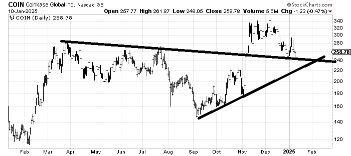Coinbase COIN is trying to hold this 240 area so as long as it does so the stock is okay. The risk is that it comes down to tag 220 first so I’m going to have to couch it in the 220-240 area. A swift move to 220 might shake out weak holders.