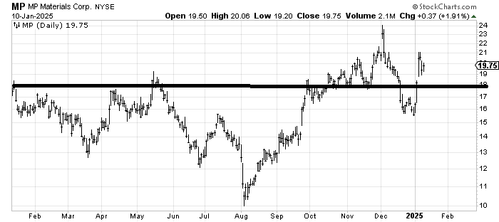 MP Materials MP is an old friend of ours but I had given up on it when it traded under 18. Yet now it has recaptured it and that gap up has consolidated. I’d buy a gap fill at/near 18 with an eye toward that old spike high near 24.