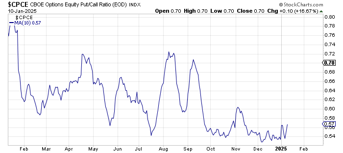 The put/call ratios have come off the boil, but that’s where I see no panic. The ten-day moving average of the equity put/call ratio is finally lifting its head up. Just think what a few more down days would do to lift this up. At least it would finally look like there was some put buying going on.