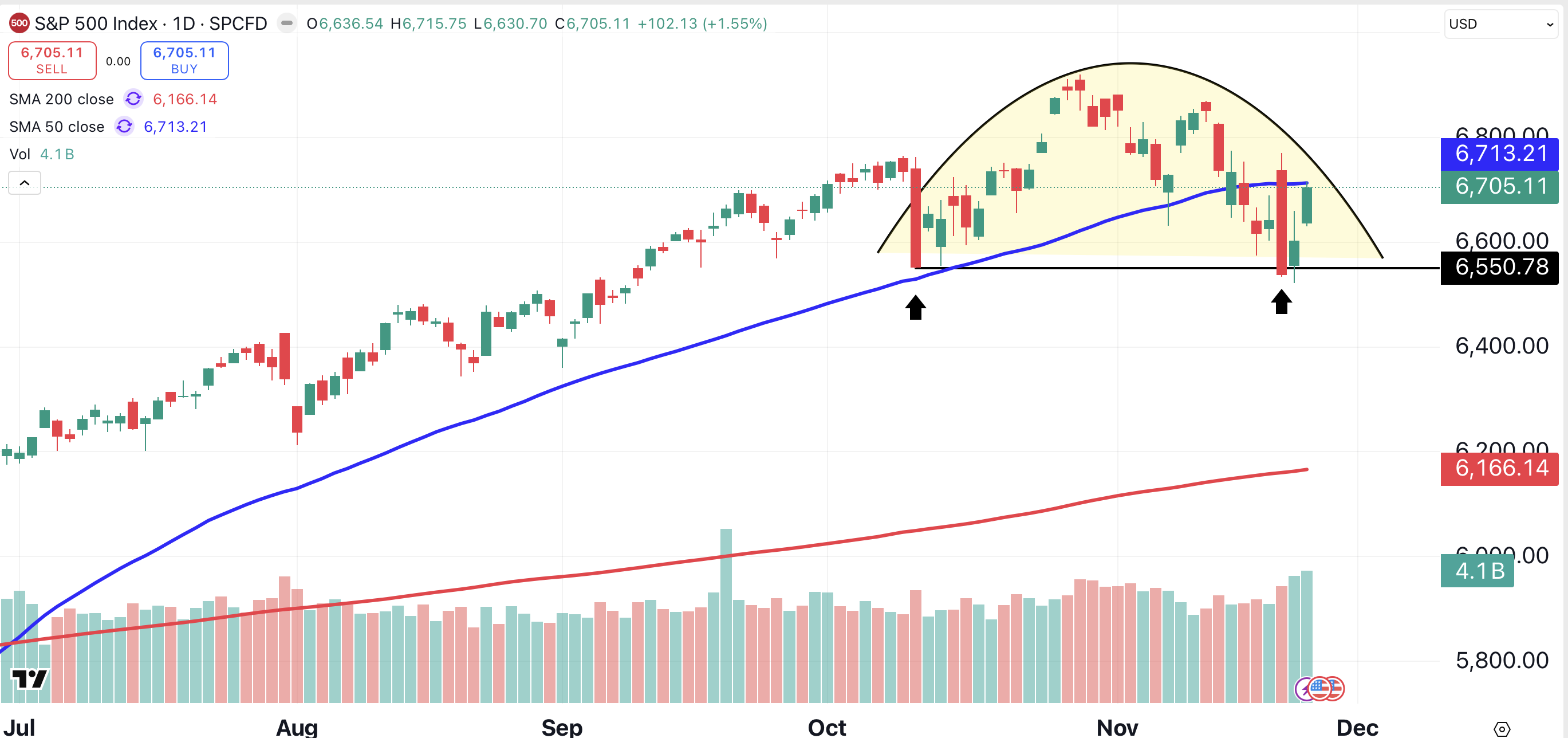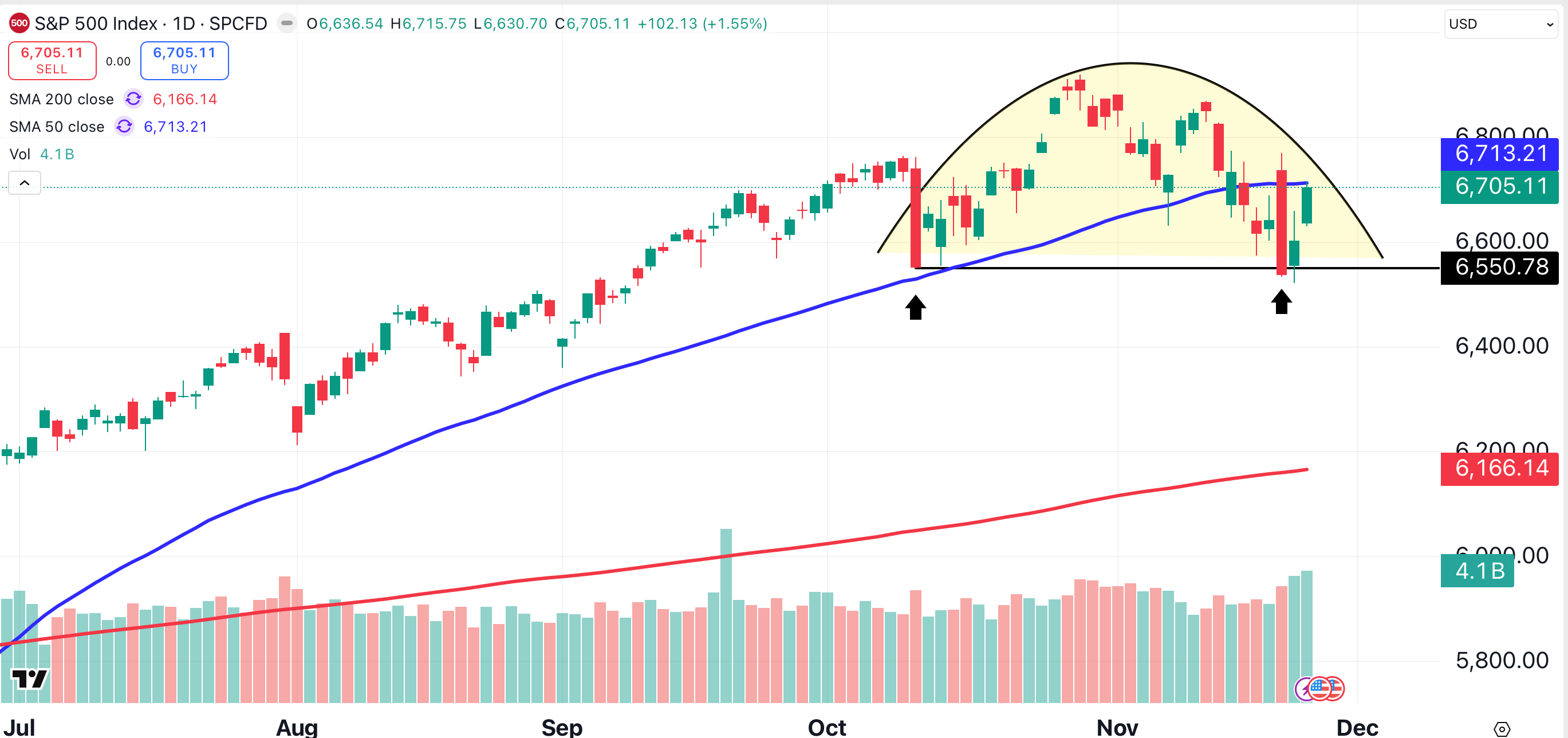 The S&P 500 rallied after finding strong support just below the 6550 level (black horizontal line). That area is now the origin of two solid bounces (arrows).
