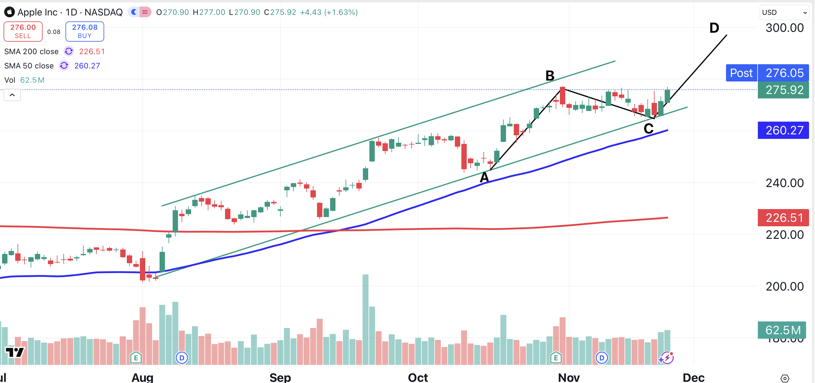 Within that channel, Apple has formed an A-B-C-D pattern (black lines). According to that pattern, Apple is headed to $300 per share.
