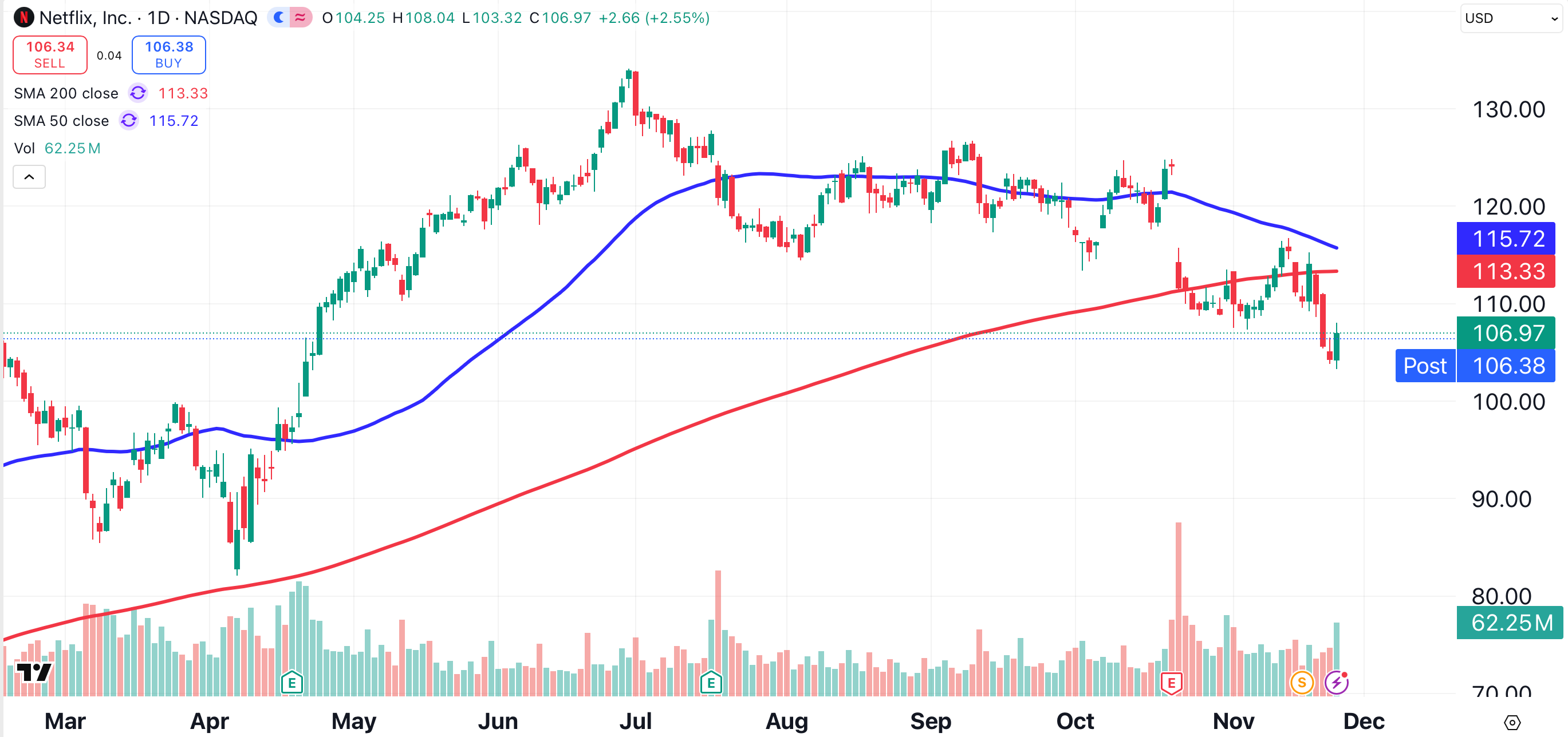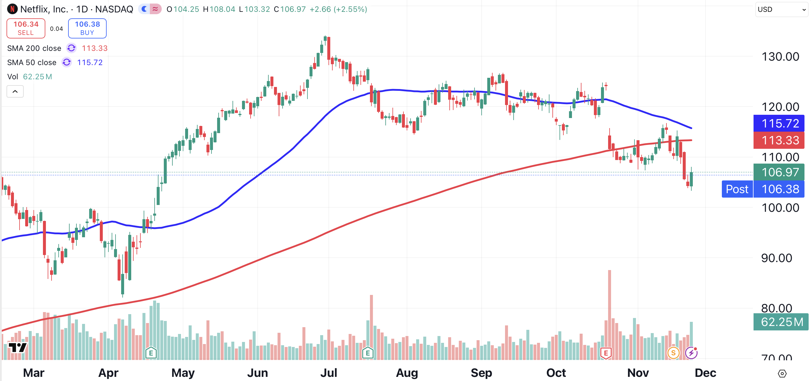 Netflix (NFLX) is experiencing a sustained move below its 200-day MA (red) for the first time in two years. On Friday, shares of the streaming giant closed at a six-month low.