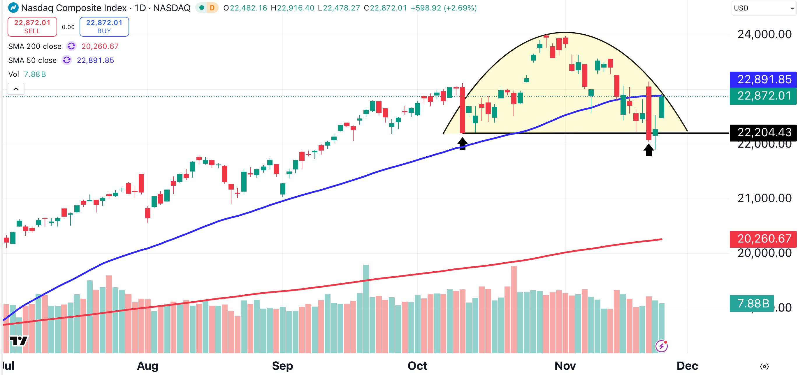 The Nasdaq Composite also closed just below its 50-day MA (blue), after holding support again just below 22,200 (black horizontal line).